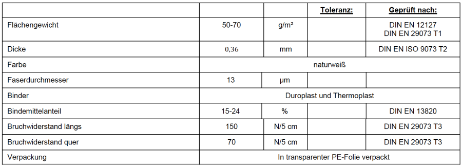 Glasfaservlies im Naßvliesverfahren hergestellt mit Verstärkungsfäden in Längsrichtung. Feinheit der Verstärkungsfäden längs: 34 tex Fadenabstand über die Breite: 30 mm Standardabmessung: Rollenlänge: 300 m Rollenbreite: 1 m