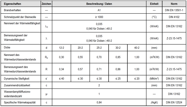 Mineralwolle Dämmstoff gemäß DIN EN 13162/MW EN 13162 T7-DS(T+)-SDi-CP2.